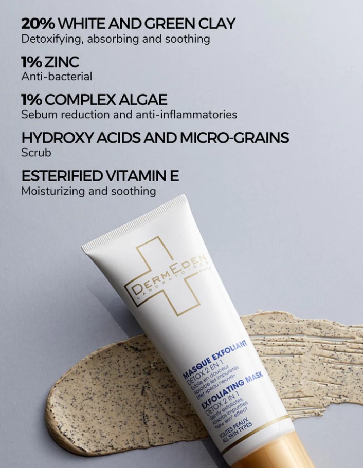 Mặt nạ tẩy tế bào chết Detox 2 in 1 DermEden Exfoliating Mask chứa đất sét, kẽm, phức hợp tảo biển và Vitamin E được Este hoá giúp loại bỏ gốc tự do, mang lại tác dụng chống oxy hóa mạnh mẽ, đồng thời làm dịu da và hấp thụ dư lượng dầu và bụi bẩn. Điều này giúp làm sạch da sâu và duy trì sự cân bằng tự nhiên của da.